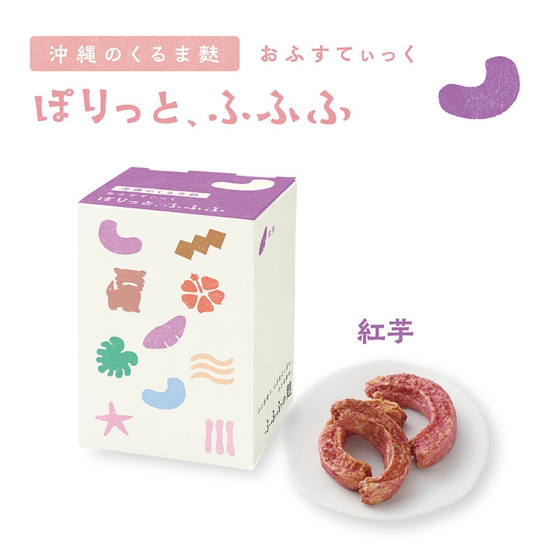 沖縄のくるま麩に黒糖蜜をコーティングし、じっくり焼き上げたスティック状のお麩菓子。ぽりっと軽やかな食感に、黒糖の深い甘みがアクセント。沖縄らしい「紅芋」風味でご用意。
